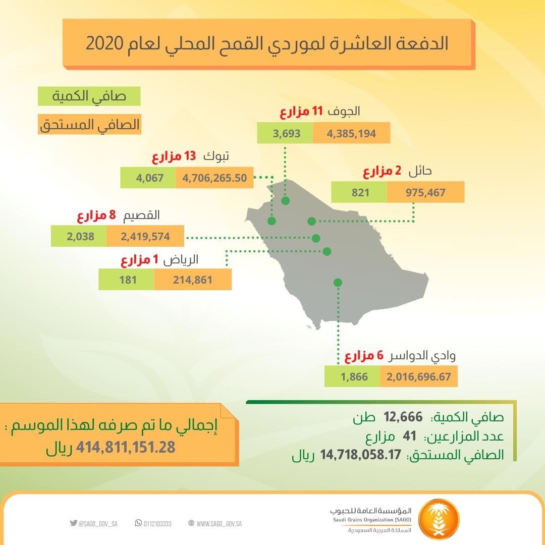 وبلغ إجمالي ما تم إيداعه لهذه الدفعة مبلغ (14,718,058.17) ريالاً بحساباتهم البنكية وذلك لعدد (41) مزارعاً، وبهذا يكون ما تمّ إيداعه مبلغ (414,811,151.28) ريالاً لعدد (1,478) مزارعاً بكمية (356,711) طنا، وسيتم إيداع الدفعات التالية بحسب الكميات الموردة وبعد استكمال إجراءات الإقفال والتدقيق.