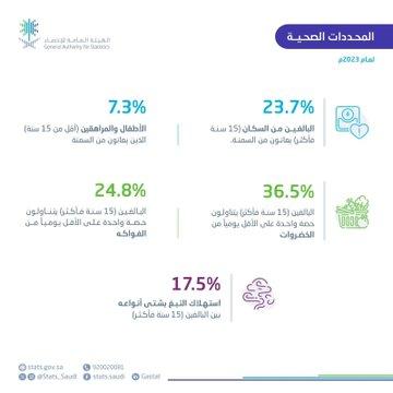 وأوضحت في نشرة مؤشرات المحددات الصحية في المملكة لعام 2023م التي أعلنت عنها اليوم أن نسبة انتشار السمنة بين الأطفال من هم دون سن الـ15 بلغت 7.3 % بينما بلغت نسبة الأطفال الذين هم أقل من الوزن الطبيعي 41 % .
