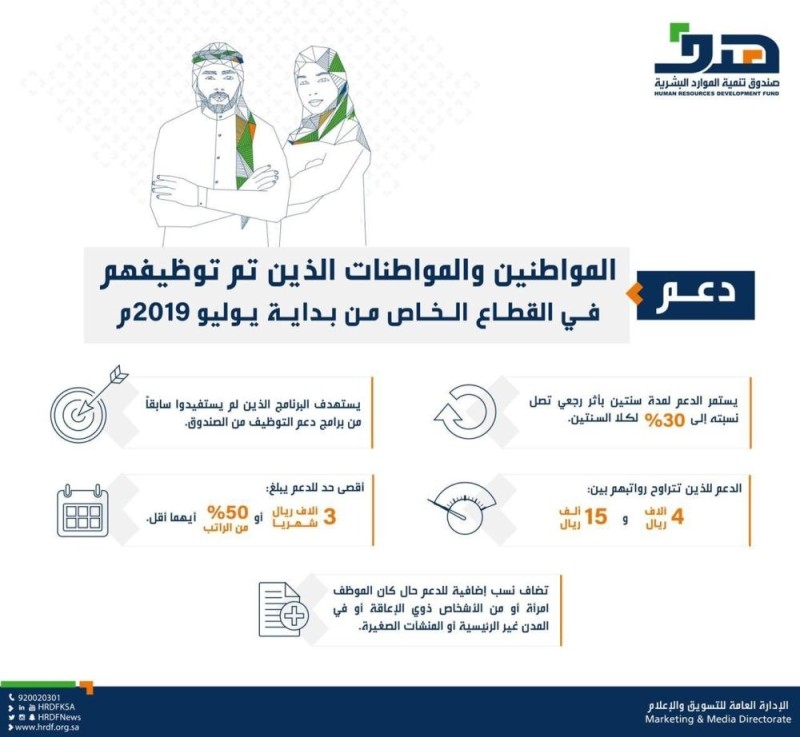 قال وزير الموارد البشرية والتنمية الاجتماعية أحمد سليمان الراجحي إنه تفعيلاً لمبادرات الدعم الحكومي لتمكين المنشآت وضمان استقرارها وتنمية أعمالها، أطلقنا في صندوق تنمية الموارد البشرية أولى المبادرات، والتي تستهدف دعم المواطنين والمواطنات من الذين تم توظيفهم في القطاع الخاص؛ وذلك بأثر رجعي من بداية يوليو 2019م،وسيتبعها -بمشيئة الله- بقية المبادرات.