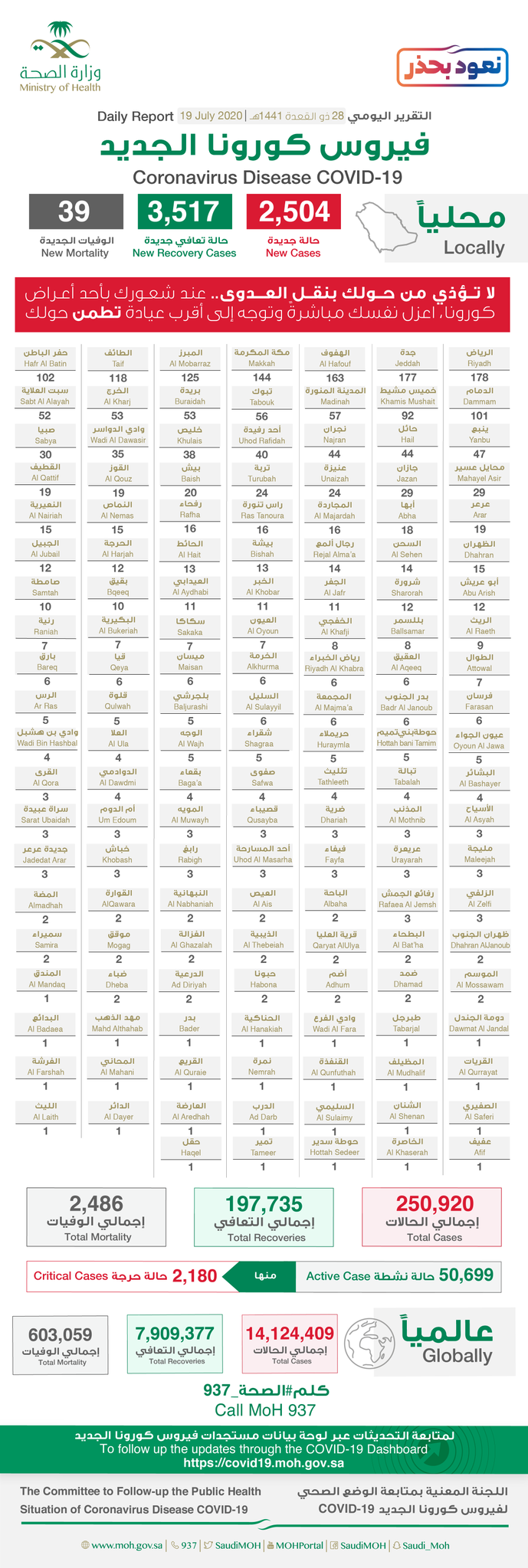 سجلت منطقة نجران 74 اصابه جديدة.. الصحة تعلن عن تسجيل (2504) حالة إصابة جديدة بفيروس #كورونا الجديد (كوفيد19)