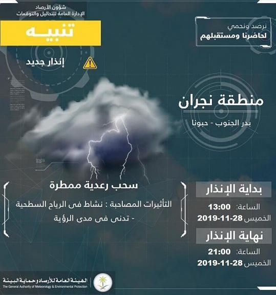 تبدأ بعد ظهر اليوم الخميس وتستمر حتى التاسعه مساءً .. الأرصاد تتوقع سحب رعديه ممطره على منطقة نجران