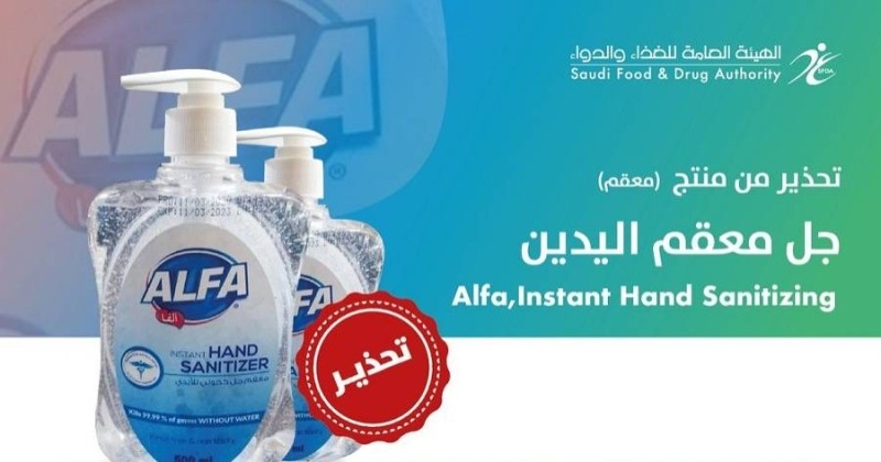 حذّرت الهيئة العامة للغذاء والدواء من جل معقم لليدين يحمل اسم «Alfa,Instant Hand Sanitizing» وينتجه مصنع الكيماويات الحديثة، بسبب احتوائه على نسبة عالية من الكحول الميثيلي (ميثانول).