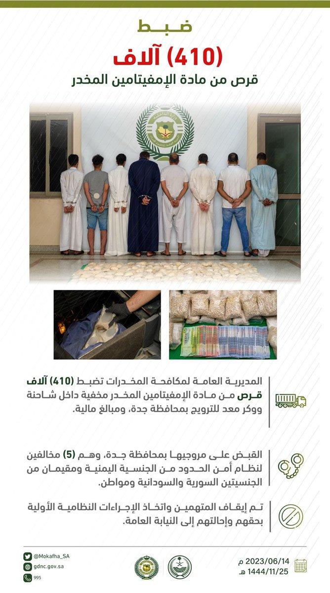صرح المتحدث الرسمي للمديرية العامة لمكافحة المخدرات الرائد مروان الحازمي، بأن المتابعة الأمنية لشبكات تهريب وترويج المخدرات التي تستهدف أمن المملكة وشبابها، أسفرت عن ضبط (410) آلاف قرص من مادة الإمفيتامين المخدر مخفية داخل شاحنة نقل بضائع ووكر معد للترويج بمحافظة جدة، والقبض على (8) مروجين، وهم (5) مخالفين لنظام أمن الحدود من الجنسية اليمنية ومقيمان من الجنسيتين السورية والسودانية ومواطن، وضبط بحوزتهم مبالغ مالية، وجرى إيقافهم واتخاذ الإجراءات النظامية الأولية بحقهم وإحالتهم إلى النيابة العامة.