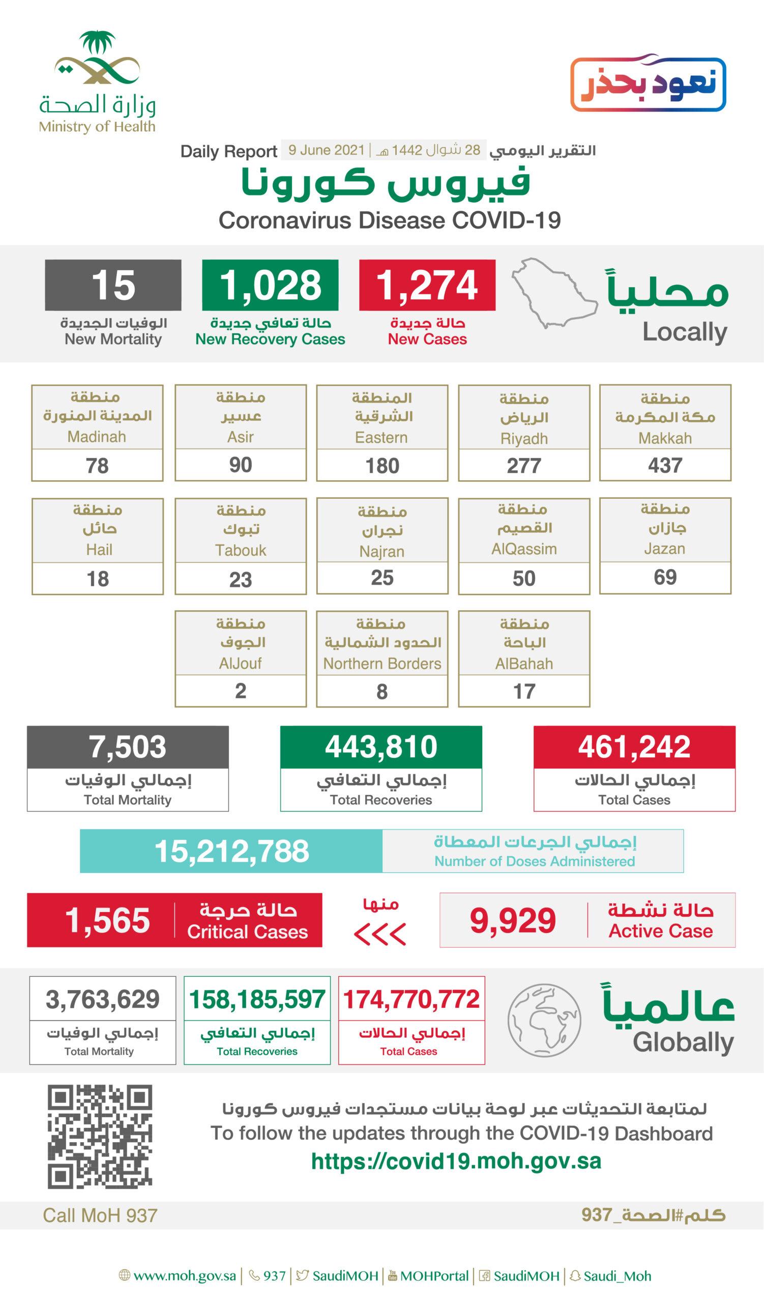 سجلت منها منطقة نجران 25 حالة.. #الصحة تعلن عن تسجيل (1274) حالة إصابة جديدة بفيروس كورونا