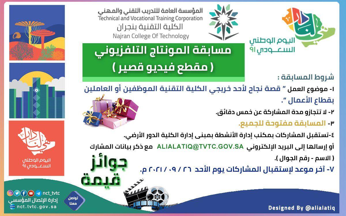 اطلقت الكلية التقنية بنجران عدد من المسابقات احتفاءً باليوم الوطني السعودي 91 خصصت منها مسابقتين لمتدربي الكلية ومسابقتين مفتوحة للجميع بهدف دعم المواهب الوطنية وتنمية القدرات لديهم.