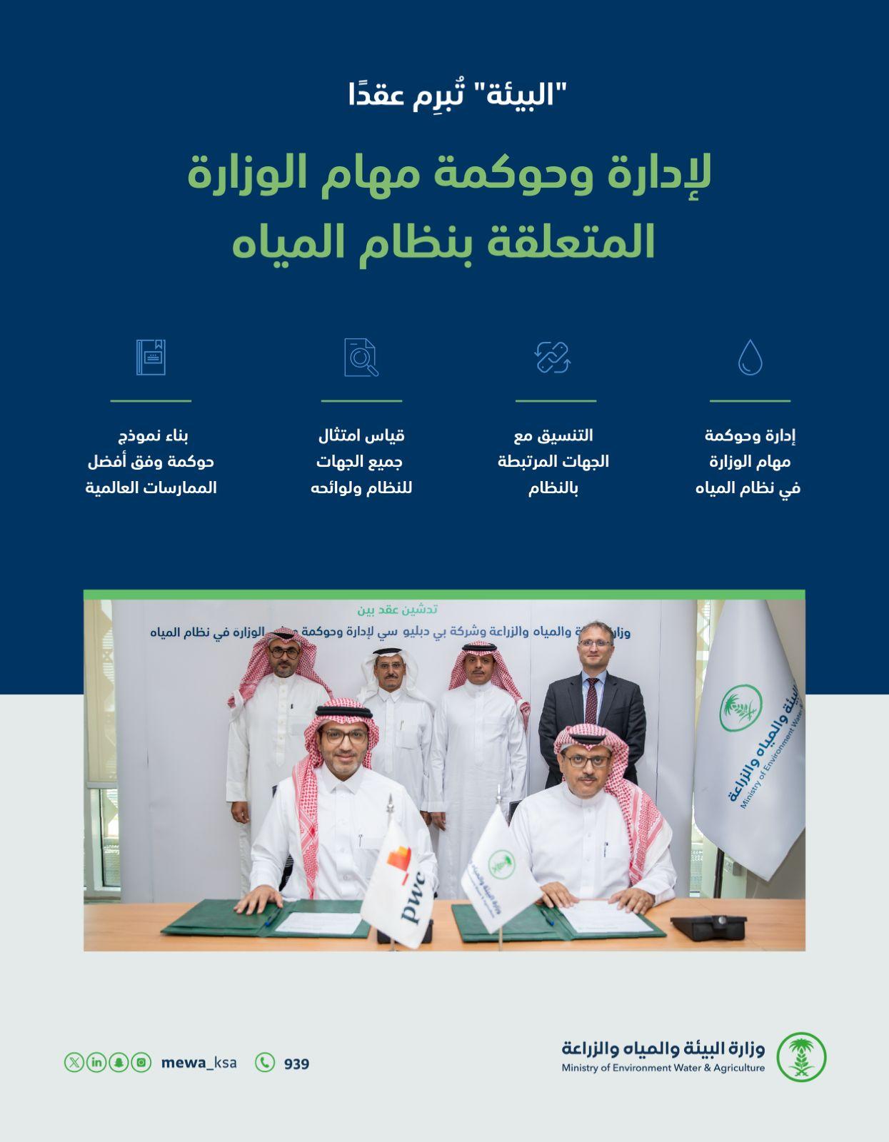 أبرمت وزارة البيئة والمياه والزراعة عقدًا لمشروع إدارة وحوكمة ومتابعة تنفيذ مهام الوزارة المتعلقة بنظام المياه، وذلك مع إحدى الشركات الرائدة في مجال الإدارة والحوكمة؛ بهدف إدارة وحوكمة المهام المُسندة للوزارة في نظام المياه، والتنسيق مع الجهات ذات الارتباط بالنظام، إلى جانب متابعة إنجاز المهام المُسندة لبعض الجهات.