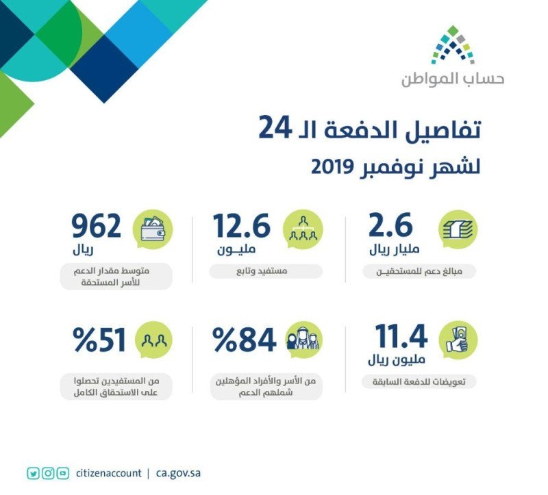 أودع اليوم برنامج حساب المواطن 2.6 مليار ريال مخصص دعم شهر نوفمبر للمستفيدين المكتملة طلباتهم، حيث بلغت نسبة المستفيدين المستوفين لمعايير الاستحقاق في هذه الدفعة 84% ليتجاوز عددهم الـ 12.6 مليون مستفيد وتابع، كما بلغ إجمالي التعويضات المدفوعة بأثر رجعي عن الدفعة السابقة 11.4 مليون ريال، ليصبح إجمالي ما دفعه البرنامج للمستفيدين منذ انطلاقته 58.2 مليار ريال منها 405 مليون ريال تعويضات عن دفعات سابقة.