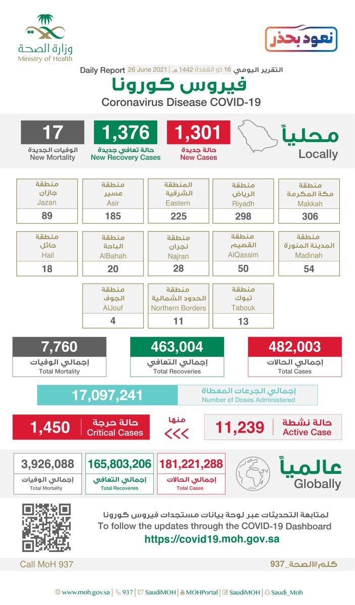 #الصحة تعلن عن تسجيل (1301) حالة إصابة جديدة بفيروس كورونا (كوفيد-19)، وتسجيل (17) حالات وفيات رحمهم الله، وتسجيل (1376) حالة تعافي ليصبح إجمالي عدد الحالات المتعافية (463,004) حالة ولله الحمد.