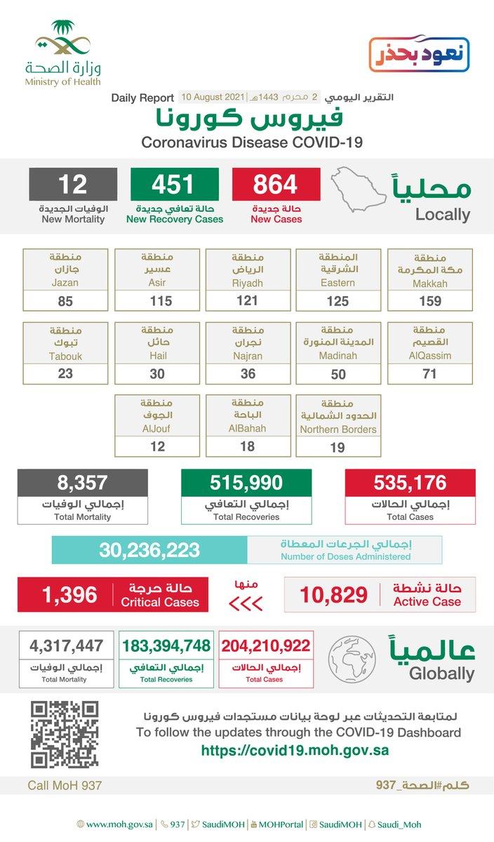 أعلنت وزارة الصحة، اليوم (الثلاثاء)، تسجيل 864 إصابة جديدة مؤكدة بفيروس كورونا المستجد (كوفيد 19)، ليرتفع إجمالي عدد الحالات في المملكة إلى 535176 حالة.