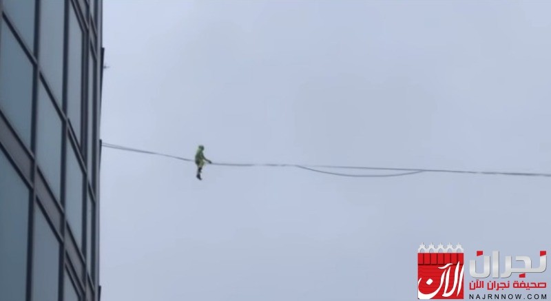 تداول رواد مواقع التواصل الاجتماعي مقطع فيديو يظهر فيه رجل يمشي على حبل ربط بين المباني الشاهقة على ارتفاع 27 طابق.