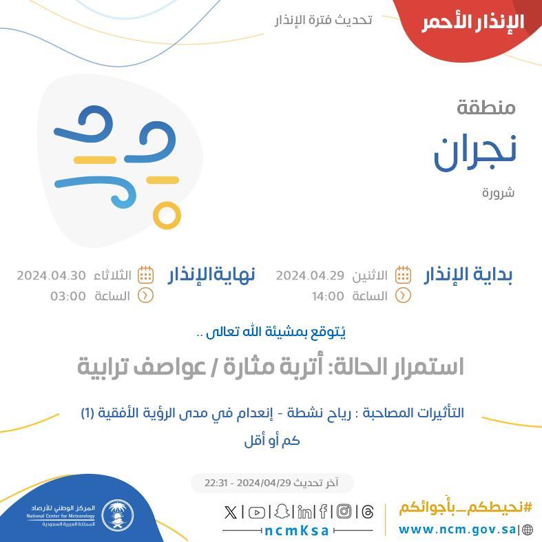 نبّه المركز الوطني للأرصاد اليوم، تنبيهاً متقدماً باللون الأحمر من أتربة مثارة وعواصف ترابية على منطقة نجران، تشمل تأثيراتها رياحاً نشطة وانعدام في مدى الرؤية الأفقية لأقل من كيلومتر ، على مدينة نجران، ومحافظات بدر الجنوب ، وثار ، وحبونا ، و خباش ، ويدمة.
