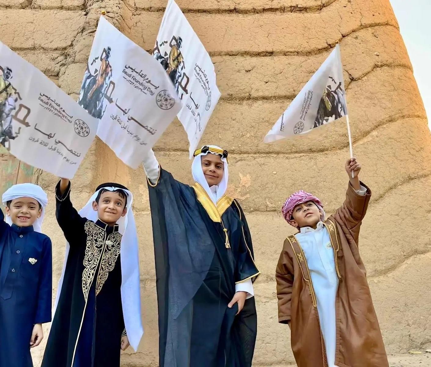 وتوشح الأطفال بالزي السعودي التقليدي والتراثي، وهم يحملون شعار التأسيس، بجوار أحد القصور الطينية التراثية ، بما تمثله من أصالة وتاريخ وطني ليتمازج عبق التاريخ وأصالته بالحاضر المجيد وروعته ليبرز أثر المناسبة في نفوسهم وما تحمله من عمق ثقافي ووطني مسطَّر بتاريخ مجيد، وعلامات السرور بادية على محياهم.