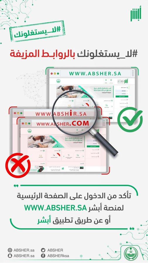 وأكدت منصة أبشر أن الوصول إلى المنصة يتم فقط من خلال الرابط الرسمي ABSHER.sa أو من خلال التطبيق الرسمي.
