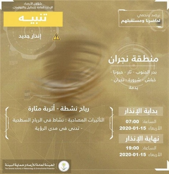 نبهت الهيئة العامة للأرصاد وحماية البيئة اليوم، من نشاط في الرياح السطحية، مما يؤدي إلى إثارة الأتربة والغبار والحد من مدى الرؤية الأفقية على منطقة نجران، تشمل مدينة نجران، ومحافظات بدر الجنوب، ثار، حبونا، يدمة، خباش، شرورة، تستمر حتى الساعة الـ 7 مساءً.