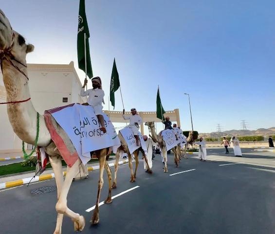 ويتقدم المسيرة هجانة يحملون راية التوحيد “لا إله إلا الله محمد رسول الله”، وصور القيادة الرشيدة، وشعارات وطنية، وشعارات تحمل عبارات يوم التأسيس “يوم بدينا”، وطن أسس ليبقى شامخاً.