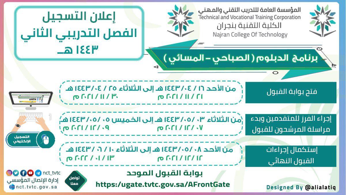 أعلنت الكلية التقنية بنجران عن موعد التسجيل واستقبال طلبات القبول في برنامج الدبلوم الصباحي والمسائي للفصل التدريبي الثاني من العام التدريبي 1443 هـ