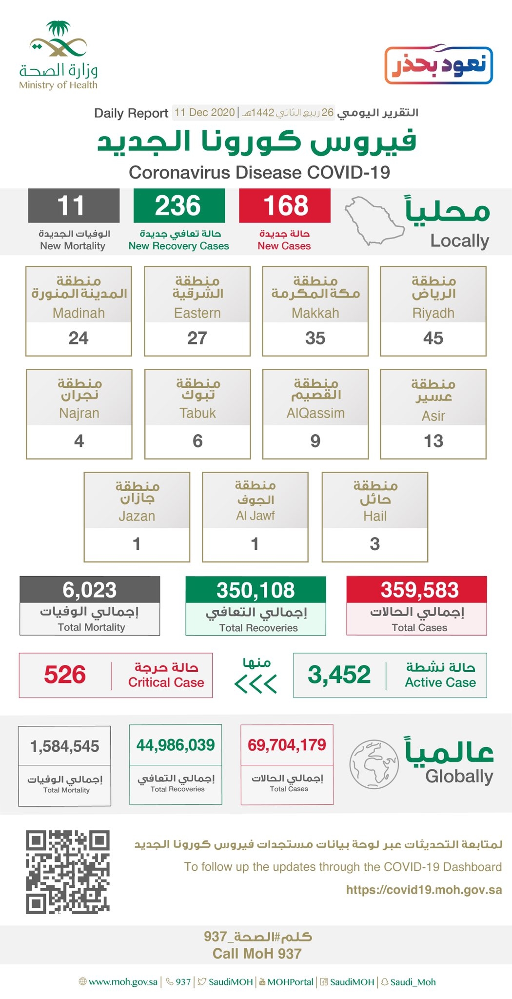 الصحة تعلن عن تسجيل (168) حالة إصابة جديدة بفيروس كورونا الجديد (كوفيد19)، وتسجيل (11) حالات وفيات رحمهم الله، وتسجيل (236) حالة تعافي ليصبح إجمالي عدد الحالات المتعافية (350,108) حالة ولله الحمد.