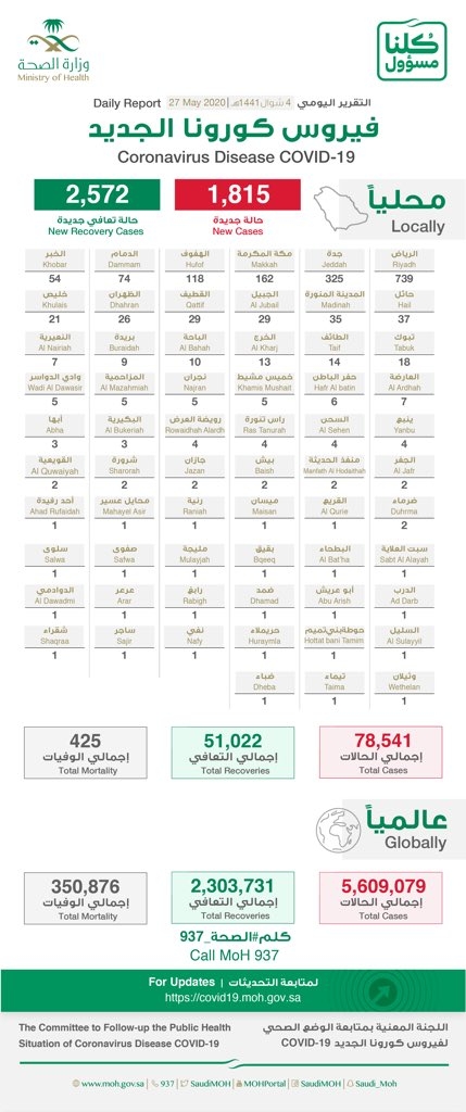 #الصحة تعلن عن تسجيل (1815) حالة إصابة جديدة بفيروس #كورونا الجديد (كوفيد19)، وتسجيل (14) حالات وفيات رحمهم الله، وتسجيل (2572) حالة تعافي ليصبح إجمالي عدد الحالات المتعافية (51,022) حالة ولله الحمد.