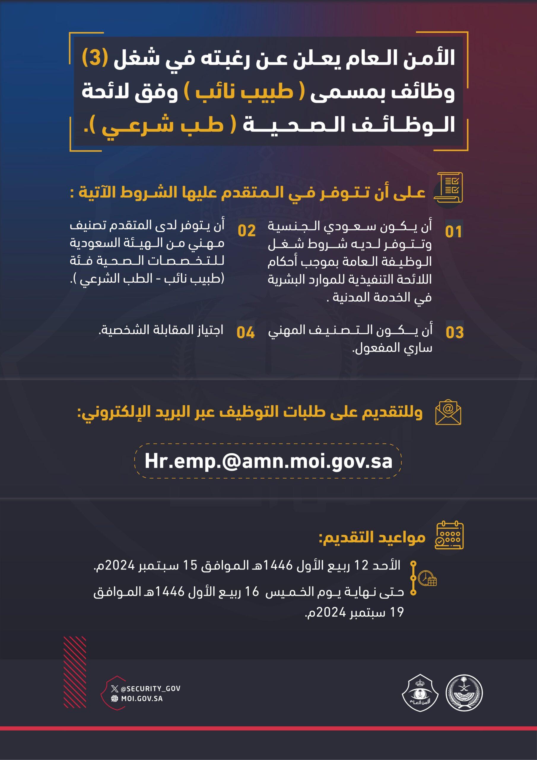 أعلن الأمن العام عن (3) وظائف بمسمى (طبيب نائب) وفق لائحة الوظائف الصحية (طب شرعي، وذلك وفقًا للتفاصيل الموضحة أدناه.