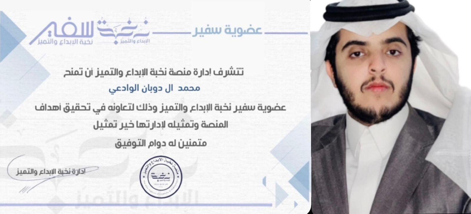 الإعلامي والكاتب / محمد ال دوبان الوادعي سفيراً لمنصة نخبة الإبداع والتميز على مستوى الوطن العربي