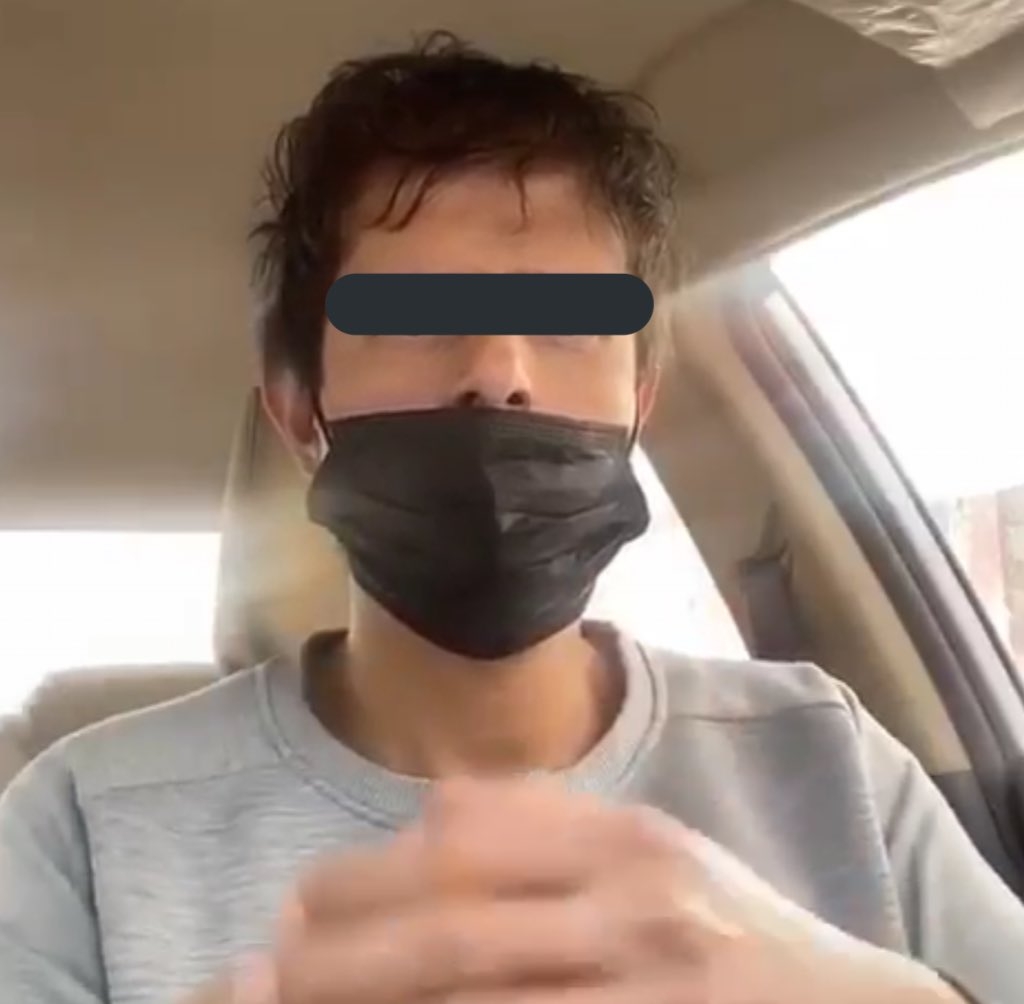ونشر المقيم، مقطع فيديو مصورًا وهو داخل مركبة يرتدي كمامة، بعدها قام بنزع الكمامة غير مبالٍ بها. ليخرج كيسًا من النقود المعدنية، ويتعمد البصق عليها.