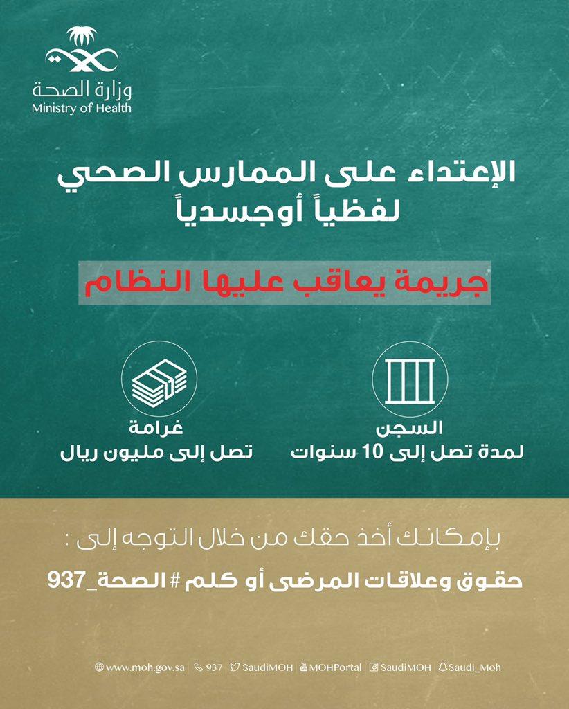 – غرامة تصل إلى مليون ريال. #الاعتداء_على_الممارس_الصحي_جريمة https://t.co/pMyR3dtAoW— و ز ا ر ة ا لـ صـ حـ ة السعودية (@SaudiMOH) ٢٦ يوليو ٢٠٢١