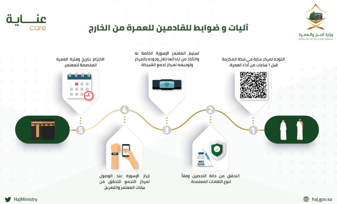 وبيّنت الوزارة أن المعتمر يتوجه لمركز عناية في مكة المكرمة قبل 6 ساعات من أداء العمرة، للتحقق من حالة التحصين وفقًا لنوع اللقاحات المعتمدة.