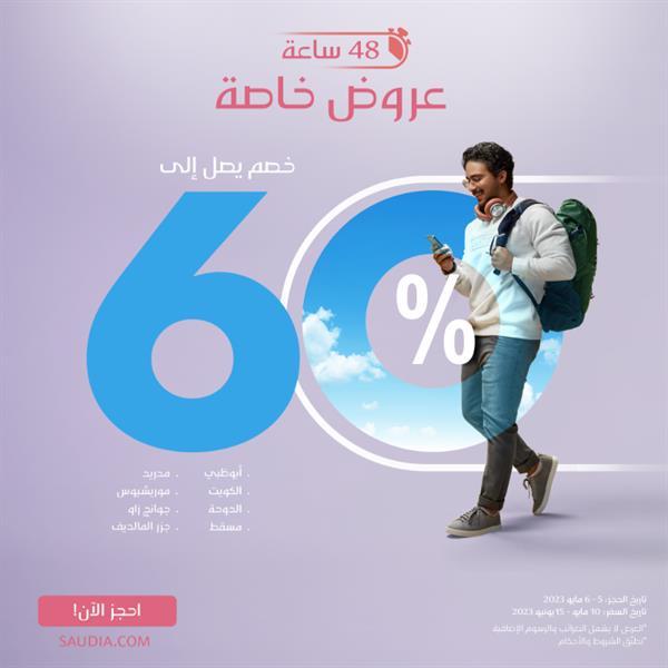أعلنت شركة الخطوط الجوية السعودية، عن تقديم خصم يصل إلى 60% على رحلاتها المتجهة إلى عدد من الوجهات العربية والعالمية.