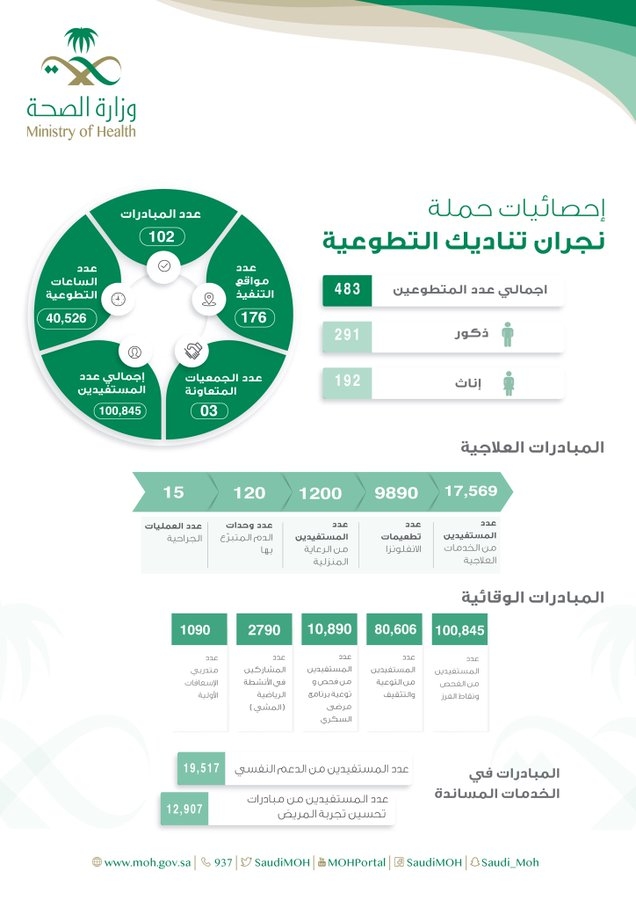 وأوضحت المديرية العامة للشؤون الصحية في نجران أن عدد المتطوعين في الحملة بلغ 483 متطوعا، 291 من الذكور، و192 من الإناث، فيما استفاد من المبادرات العلاجية 17569 شخصا، وبلغت تطعيمات الإنفلونزا 9890 تطعيما، إضافة إلى 1200 مستفيد من الرعاية المنزلية، وإجراء 15 عملية جراحية، و120 وحدة تبرع دم.