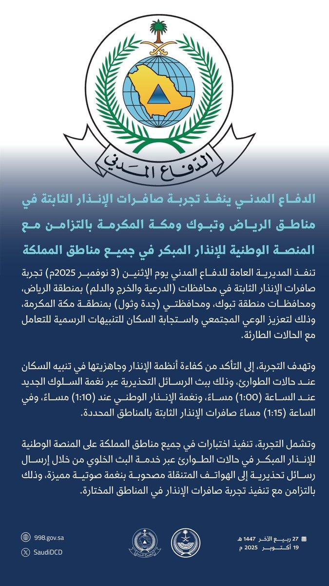تنفذ المديرية العامة للدفاع المدني يوم الاثنين (3 نوفمبر 2025م) تجربة صافرات الإنذار الثابتة في محافظات (الدرعية والخرج والدلم) بمنطقة الرياض، ومحافظات منطقة تبوك، ومحافظتي (جدة وثول) بمنطقة مكة المكرمة، وذلك لتعزيز الوعي المجتمعي واستجابة السكان للتنبيهات الرسمية للتعامل مع الحالات الطارئة.