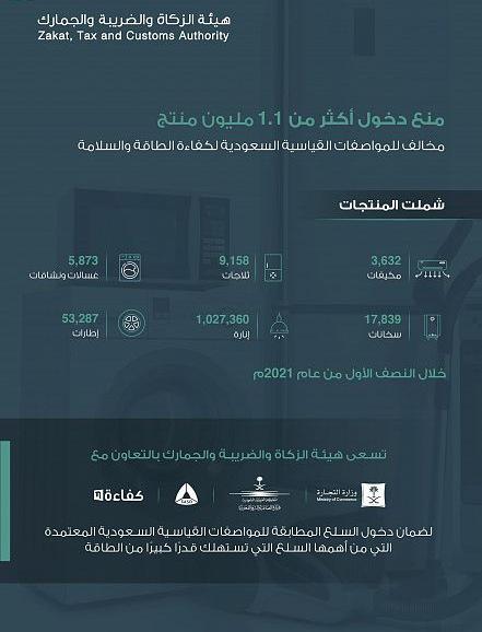 منعت هيئة الزكاة والضريبة والجمارك دخول (1.117.149) منتج مخالف للمواصفات القياسية الإلزامية الخاصة بالسلامة وكفاءة الطاقة، وذلك خلال النصف الأول من العام 2021م، وشملت هذه المنتجات المعاد تصديرها (أجهزة تكييف، غسالات، نشافات، ثلاجات، سخانات، إنارة، إطارات).