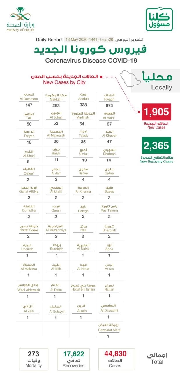 ” الصحة”: تسجيل 1905 إصابة جديدة بـ”كورونا”.. تعرف على توزيع الحالات حسب مدن المملكة