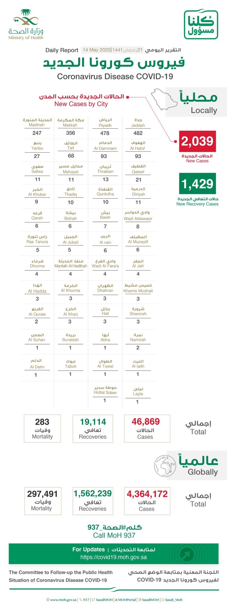 سجلت منها 3 حالات في شرورة.. الصحة: تسجيل 2039 إصابة جديدة بـ”كورونا”.. تعرف على توزيع الحالات حسب مدن المملكة