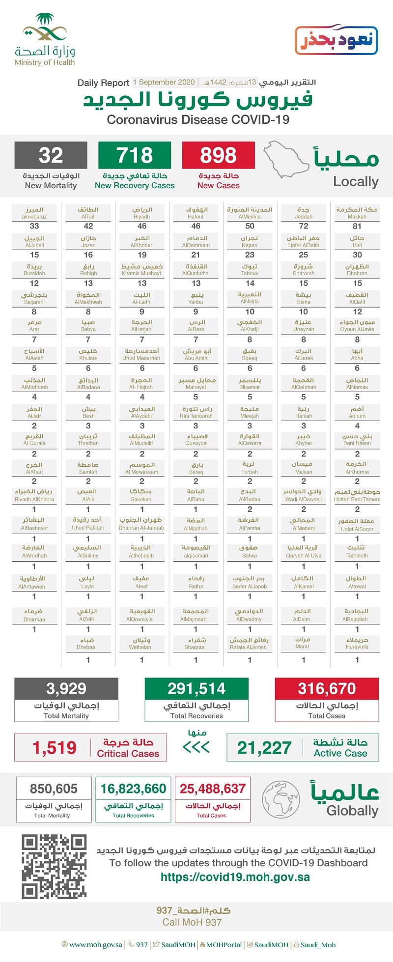 سجلت منها منطقة نجران 39 حالة توزعت على مدينة نجران ومحافظات شرورة وبدر الجنوب.. الصحة تسجل 898 إصابة جديدة بفيروس كورونا