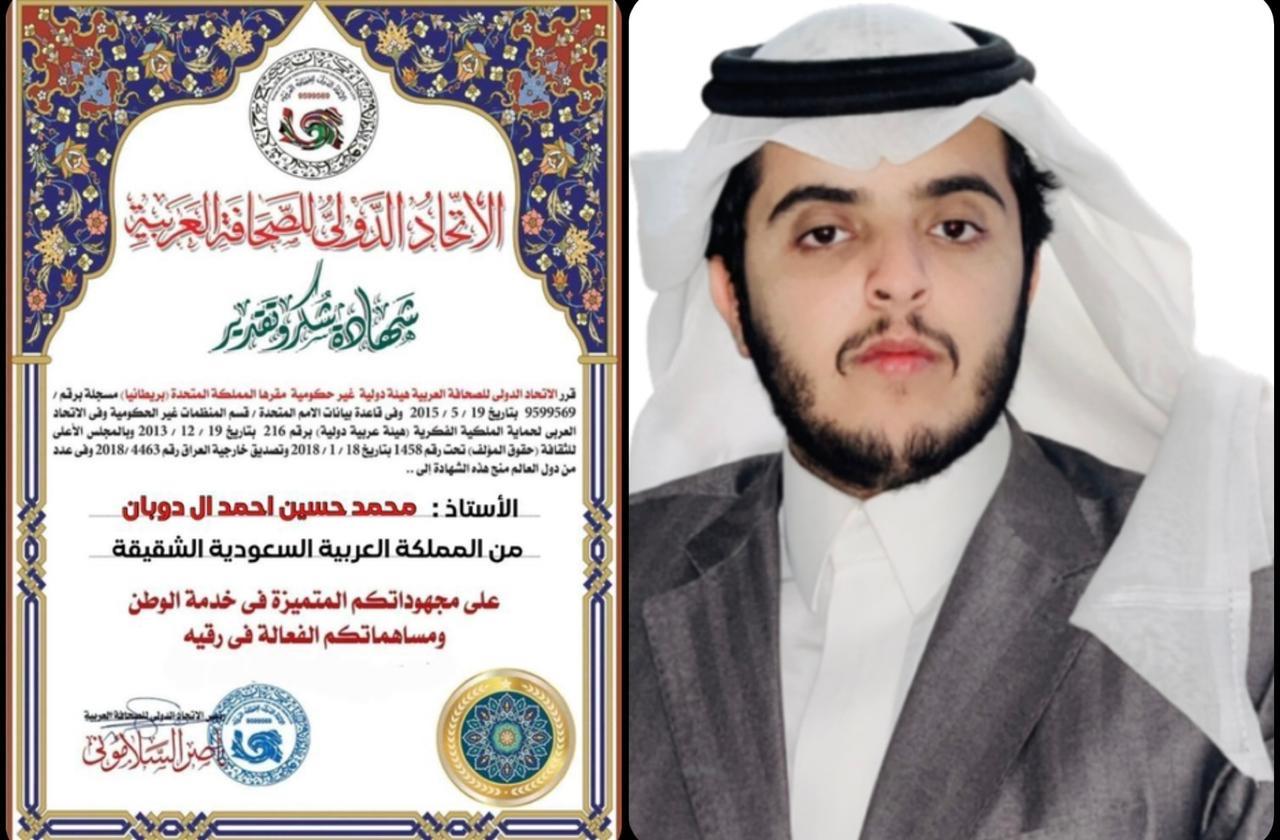الكاتب الصحفي محمد ال دوبان يحصل على شهادة شكر وتقدير من الإتحاد الدولي للصحافة العربية .