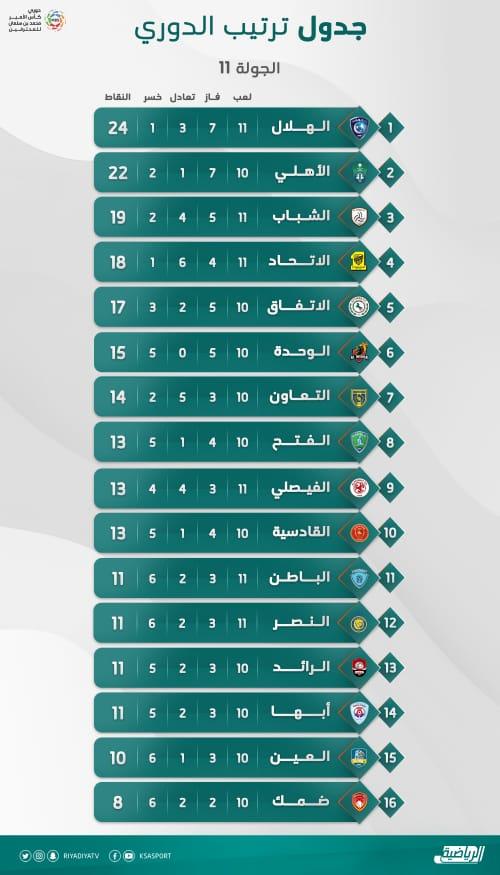وما زال فريق الهلال في صدارة ترتيب الدوري السعودي برصيد 24 نقطة، وبفارق نقطتين فقط عن فريق الأهلي صاحب المركز الثاني، وخمس نقاط عن فريق الشباب صاحب المركز الثالث.