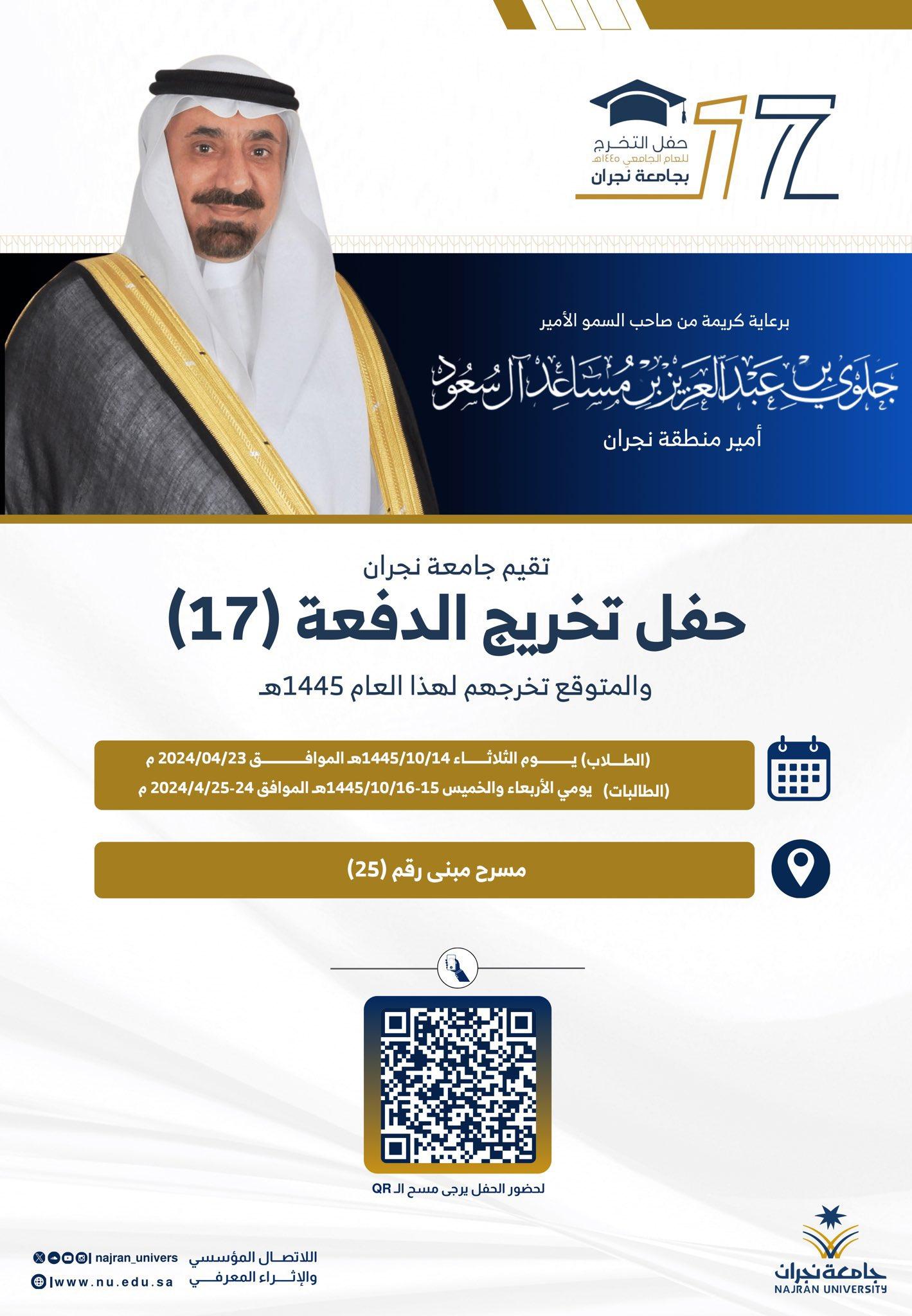يرعى صاحب السمو الأمير جلوي بن عبدالعزيز بن مساعد أمير منطقة نجران غداً، حفل تخريج الدفعة السابعة عشر من طلاب وطالبات جامعة نجران للعام الجامعي 1444-1445هـ، وذلك بمقر المدينة الجامعية.