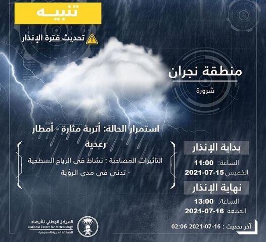 المركز الوطني للأرصاد: أتربة مثارة وأمطار رعدية على محافظة شرورة
