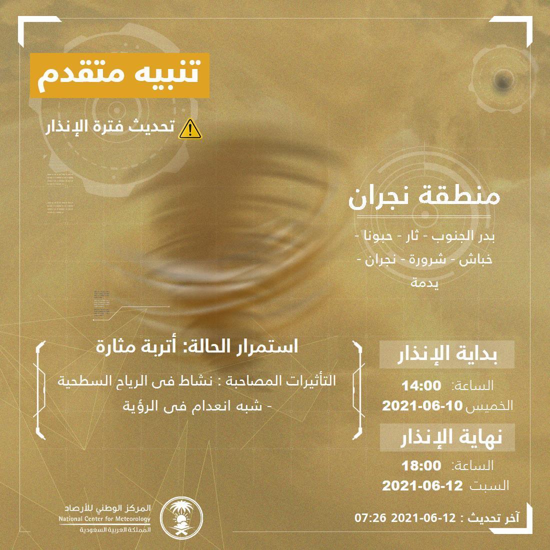 أصدر المركز الوطني للأرصاد اليوم تنبيهاً متقدماً، من رياح سطحية نشطة مثيرة للأتربة والغبار، تؤدي إلى شبه انعدام في الرؤية على منطقة نجران، تشمل مدينة نجران، ومحافظات بدر الجنوب ،و حبونا، وثار، وخباش، وشرورة، ويدمة.