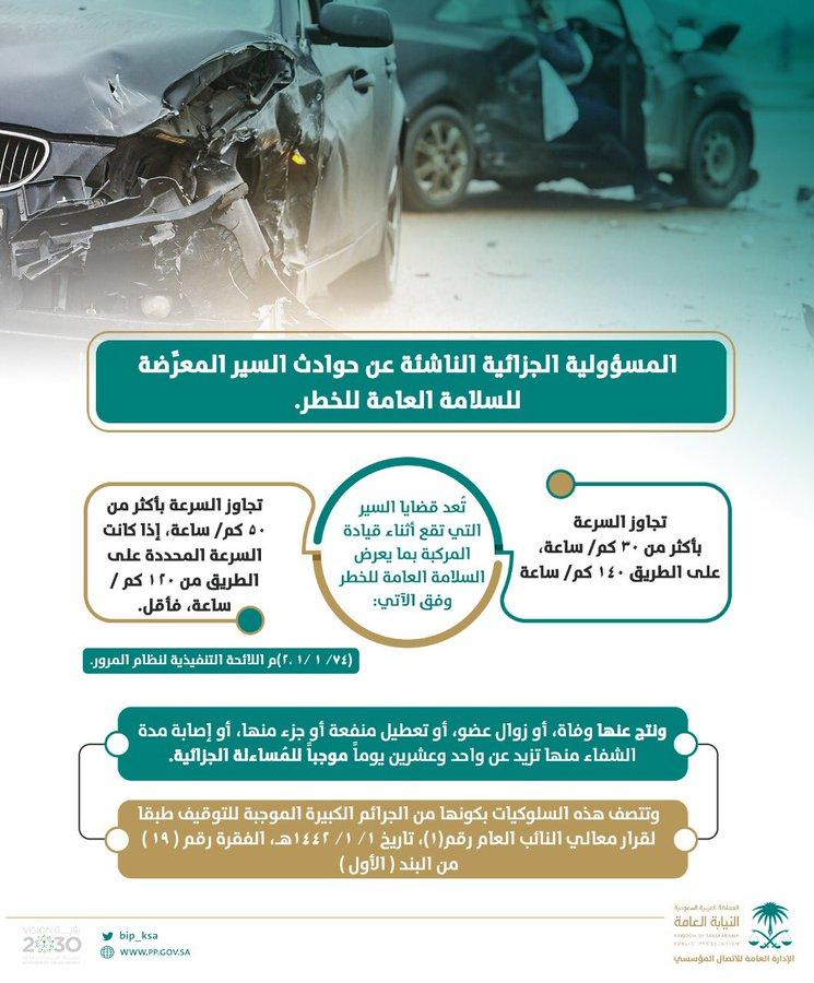 أكدت النيابة العامة أن تجاوز السرعة المسموح بها أثناء قيادة المركبات بما يعرض السلامة العامة للخطر تترتب عليه المساءلة الجزائية ، ويشمل ذلك تجاوز السرعة بأكثر من 30 كلم في الساعة على طريق 140 كلم في الساعة، وكذلك تجاوز السرعة بأكثر من 5-كلم في الساعة على طريق سرعته محددة بـ 12- كلم في الساعة أو أقل، ونتج عن ذلك وفاة أو زوال عضو أو تعطيل منفعة أو إصابة تزيد مدة الشفاء منها عن 21 يوماً.
