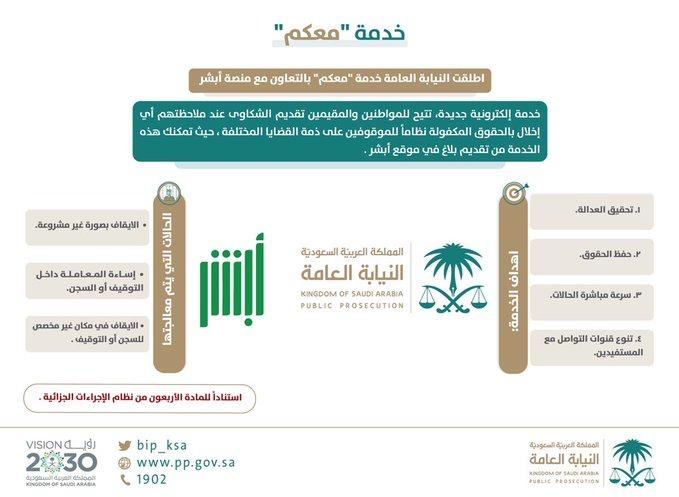 أطلقت النيابة العامة بالتعاون مع منصة أبشر ، خدمة إلكترونية جديدة ، تتيح للمواطنين والمقيمين تقديم الشكاوى عند ملاحظتهم أي إخلال بالحقوق المكفولة نظاماً للموقوفين على ذمة القضايا المختلفة.