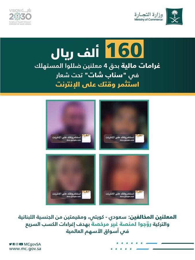 فرضت وزارة التجارة غرامات مالية بقيمة إجمالية 160 ألف ريال بحق 4 معلنين (سعودي وكويتي ومقيمتين من الجنسية اللبنانية والتركية) ضللوا المستهلك في “سناب شات”، بتعاملات مالية غير مرخصة تحت شعار “استثمر وقتك على الإنترنت”.
