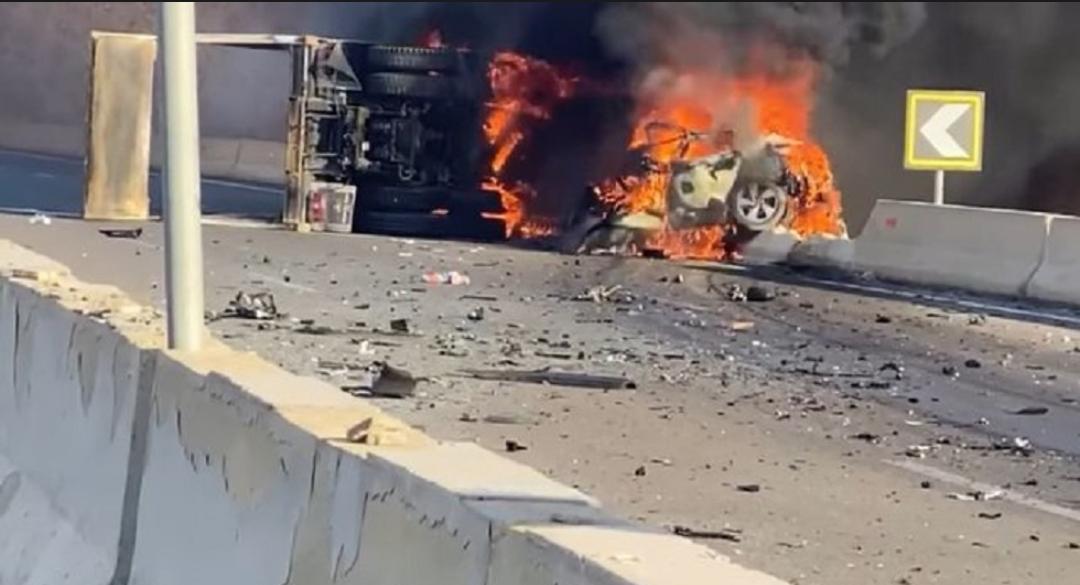 والتقط أحد المواطنين اللقطات المصورة من داخل سيارته، لسيارة تسير عكس الاتجاه بسرعة جنونية متجاوزة السيارات التي تقابلها حتى اصطدمت بقوة بإحدى سيارات النقل، ما أدى إلى انفجارها واشتعال النيران فيها على الفور.