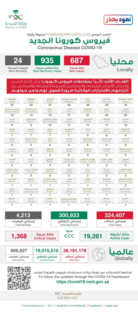 سجلت منها منطقة نجران 19 حالة جديدة توزعت على مدينة نجران ومحافظات شرورة وخباش ويدمة.. الصحة: تسجيل 687 إصابة جديدة بفيروس كورونا