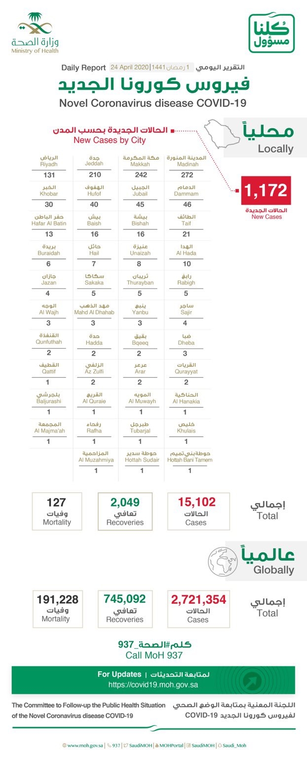 وأكد “العبد العالي” تسجيل “6 وفيات جديدة في المملكة، ليصل إجمالي الوفيات إلى 127 حالة”، ومبينًا أن من بين الحالات الجديدة المسجلة اليوم، ما نسبته 25% لسعوديين، و75% لغير سعوديين.