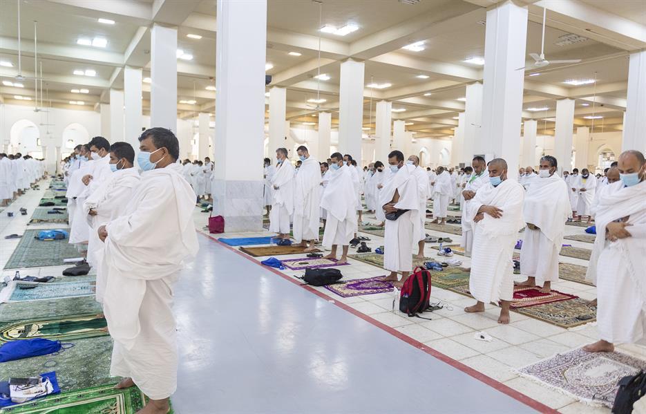 حجاج بيت الله يؤدون صلاتي الظهر والعصر بمسجد نمرة