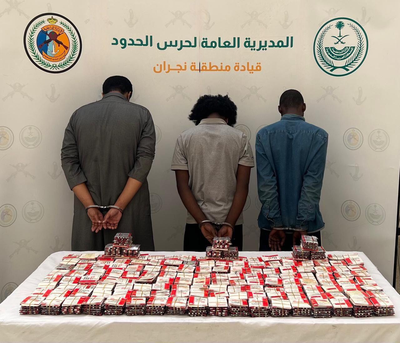 حرس الحدود بنجران يقبض على 3 أشخاص لتهريبهم 24896 قرصًا خاضعًا لتنظيم التداول الطبي
