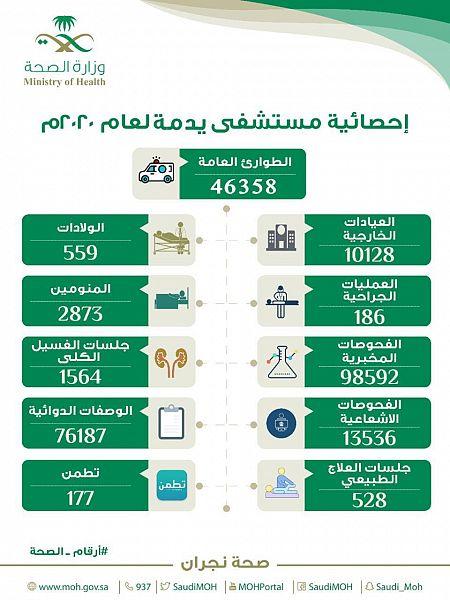 قدمت أقسام الطوارئ والعيادات الخارجية في مستشفى يدمة العام في نجران الخدمات العلاجية والاستشارية لــ 56486 مستفيداً ، خلال العام 2020م.