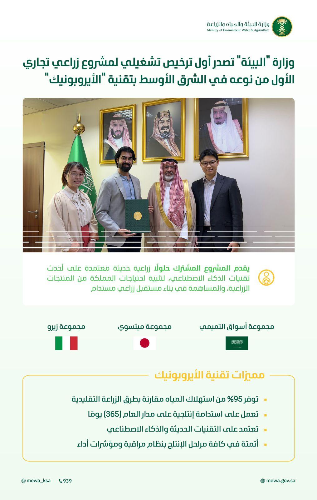 أصدرت وزارة البيئة والمياه والزراعة، أول ترخيص تشغيلي لمشروع زراعي تجاري الأول من نوعه في الشرق الأوسط بتقنية “الأيروبونيك”؛ بطاقة إنتاجية تجارية ستسهم في تغطية احتياجات الأسواق المحلية من المنتجات الزراعية المستهدفة بشكل مستدام.