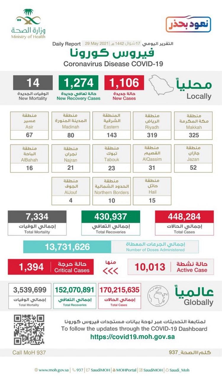 أعلنت وزارة الصحة، اليوم السبت ، عن تسجيل 1106 إصابة جديدة بفيروس “كورونا”، و 14 حالة وفاة ، و 1274 حالة تعافي .